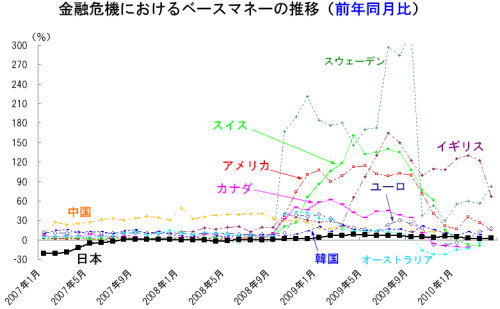 グラフを一見すると、なんだか米国やイギリスがたいしたことないように見えますが、スウェーデンが突出してベースマネー前年比300%増加という数値を出しているだけで、米国や英国も前年比100%近くの増加とかなりベースマネーが増加しています。
